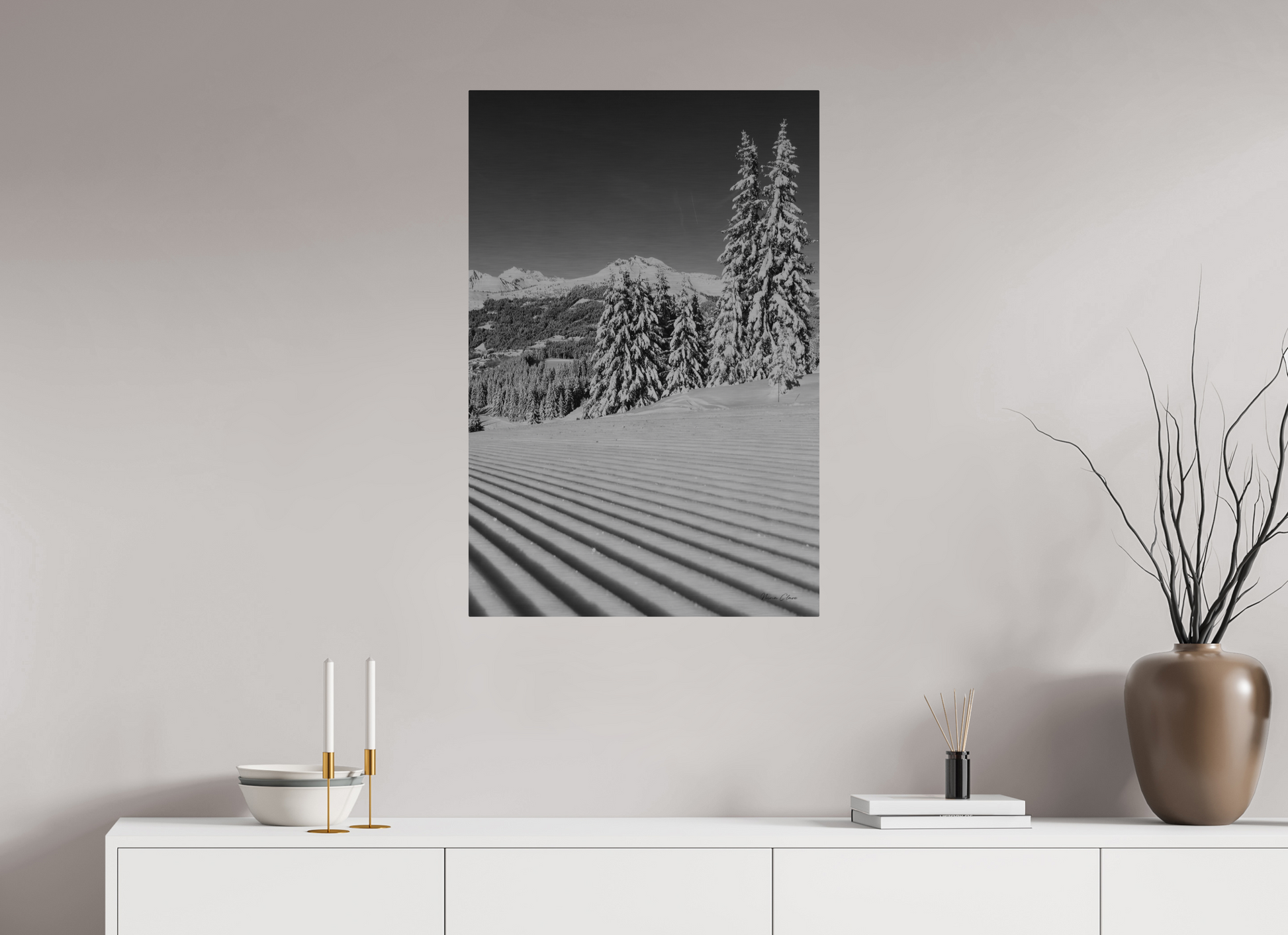 Cyclamen is a relatively new piste in Les Gets and somewhat of a hidden gem. I was out and about on my board this chilly morning and noticed that it looked relatively untouched, leaving me with a few kilometres of pristine corduroy for the taking. Who doesn’t love fresh corduroy on a bluebird day and I took this shot to capture that moment and that feeling. Taken near the very top of the piste it also captures the peaks of Uble, Chalune, Roc d’Enfer and Mont Chéry In the background.