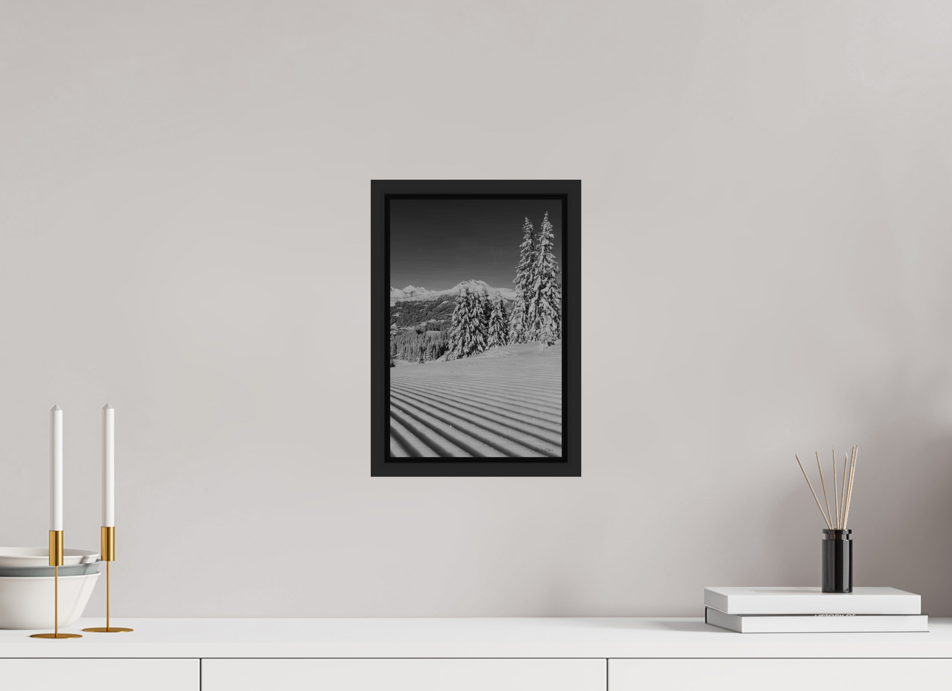 Cyclamen is a relatively new piste in Les Gets and somewhat of a hidden gem. I was out and about on my board this chilly morning and noticed that it looked relatively untouched, leaving me with a few kilometres of pristine corduroy for the taking. Who doesn’t love fresh corduroy on a bluebird day and I took this shot to capture that moment and that feeling. Taken near the very top of the piste it also captures the peaks of Uble, Chalune, Roc d’Enfer and Mont Chéry In the background.