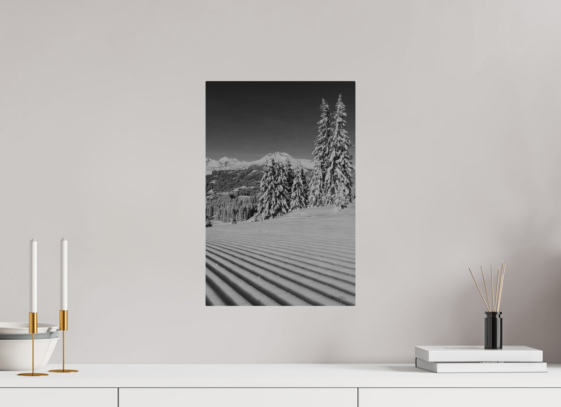 Cyclamen is a relatively new piste in Les Gets and somewhat of a hidden gem. I was out and about on my board this chilly morning and noticed that it looked relatively untouched, leaving me with a few kilometres of pristine corduroy for the taking. Who doesn’t love fresh corduroy on a bluebird day and I took this shot to capture that moment and that feeling. Taken near the very top of the piste it also captures the peaks of Uble, Chalune, Roc d’Enfer and Mont Chéry In the background.